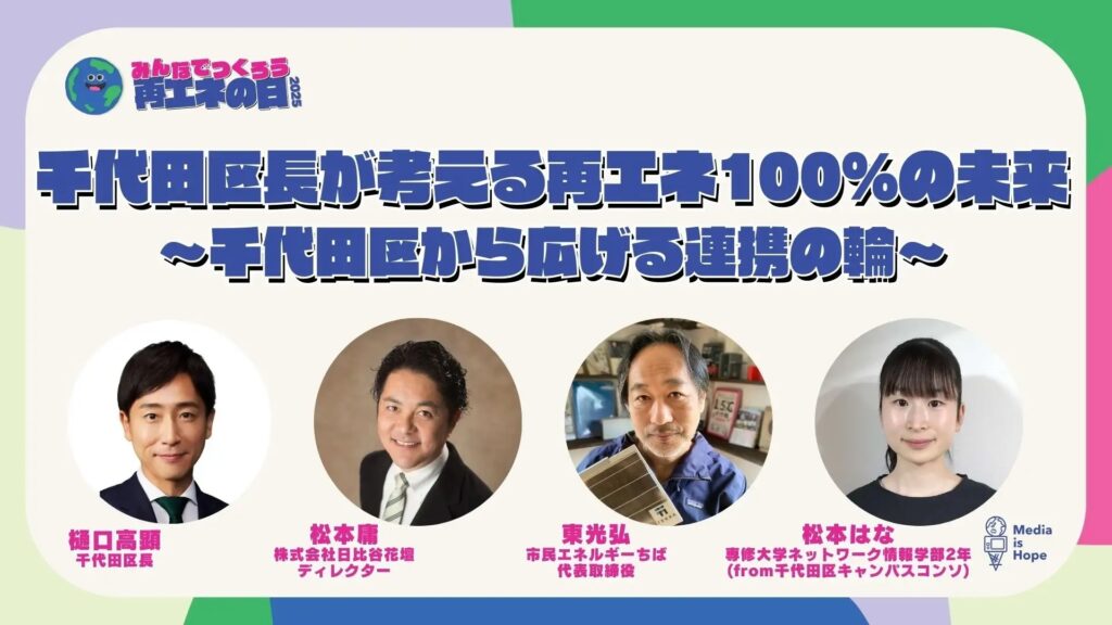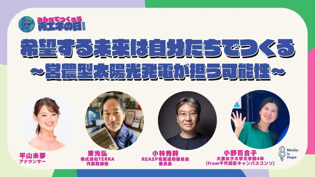 再生可能エネルギー(再エネ)の普及に向けた全国的なイベント「みんなでつくろう再エネの日!2025」(主催:一般社団法人Media is Hope)に、弊社代表・東が登壇いたします。本イベントは、気候変動の深刻化を背景に、再エネ導入や持続可能性の実現に向けて多様な立場の人々が集まり、学びや体験を共有することを目的としています。