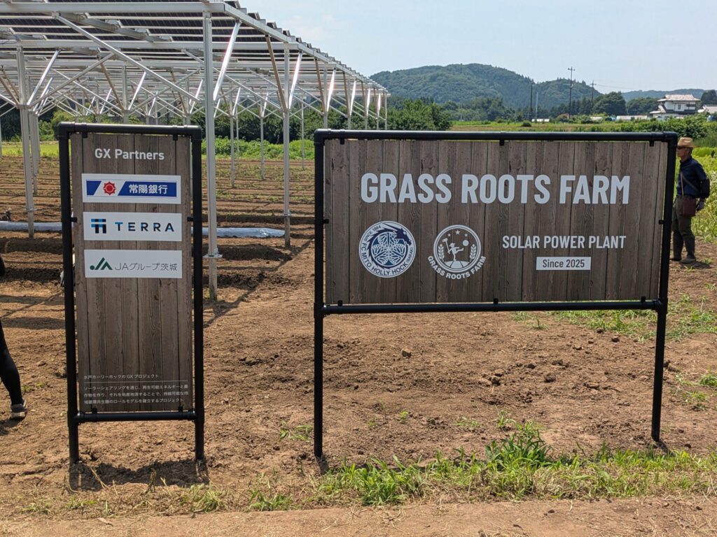 水戸ホーリーホック様は、地球温暖化や環境問題と、地域の農業衰退や耕作放棄地の増加という課題に対する解決策として、ソーラーシェアリングを活用したGXプロジェクトをスタートされました。このプロジェクトでは、地域自治体や企業、ファンサポーターと連携し、電気と農作物の地産地消を進めることで、地域における循環型共生圏のロールモデルを確立することを目指しています。また、取り組みはJリーグやサッカー界を通じて他地域へも波及することが期待されています。